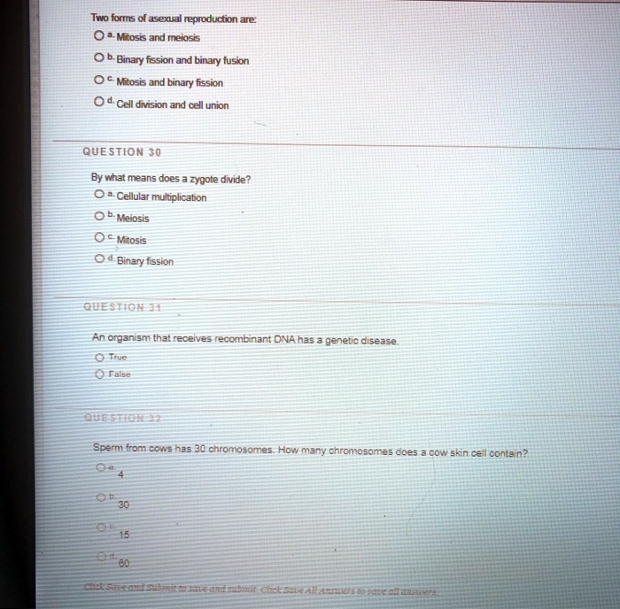 Solved Two Foms Dl Asexual Reproduction Are 0a Mtosis And Meiosis Dinary Fission And Binary Fusion Miosis And Binary Fission Cell Dmsion And Cell Union Question 30 By What Means Does Zygote Divide